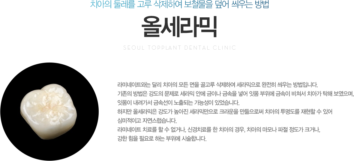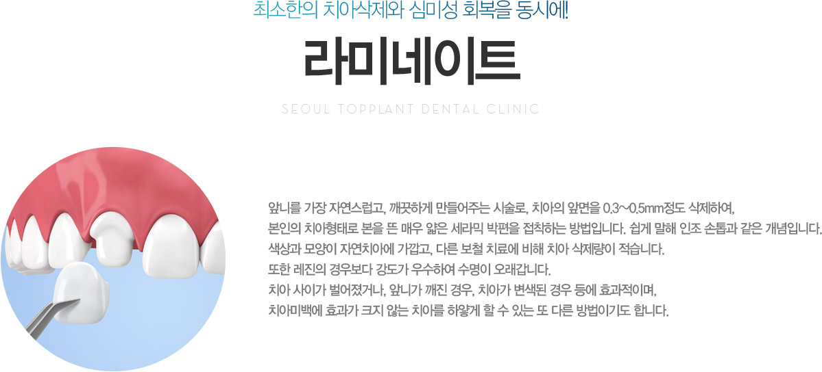 ¾Õ´Ï¸¦ °¡Àå ÀÚ¿¬½º·´°í, ±ú²ýÇÏ°Ô ¸¸µé¾îÁÖ´Â ½Ã¼ú·Î, Ä¡¾ÆÀÇ ¾Õ¸éÀ» 0.3~0.5mmÁ¤µµ »èÁ¦ÇÏ¿©, º»ÀÎÀÇ Ä¡¾ÆÇüÅ·Πº»À» ¶á ¸Å¿ì ¾ãÀº ¼¼¶ó¹Í ¹ÚÆíÀ» Á¢ÂøÇÏ´Â ¹æ¹ýÀÔ´Ï´Ù. ½±°Ô ¸»ÇØ ÀÎÁ¶ ¼ÕÅé°ú °°Àº °³³äÀÔ´Ï´Ù.