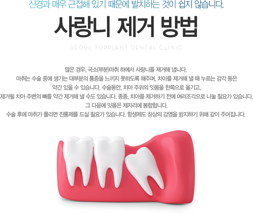 ¸¹Àº °æ¿ì, ±¹¼Ò(ºÎºÐ)¸¶Ãë ÇÏ¿¡¼­ »ç¶û´Ï¸¦ Á¦°ÅÇØ ³À´Ï´Ù. ¸¶Ãë´Â ¼ö¼ú Áß¿¡ »ý±â´Â ´ëºÎºÐÀÇ ÅëÁõÀ» ´À³¢Áö ¸øÇϵµ·Ï ÇØÁÖ¸ç, Ä¡¾Æ¸¦ Á¦°ÅÇØ ³¾ ¶§ ´©¸£´Â °¨°¢ µîÀº ¾à°£ ÀÖÀ» ¼ö ÀÖ½À´Ï´Ù. ¼ö¼úµ¿¾È, Ä¡¾Æ ÁÖÀ§ÀÇ ÀÕ¸öÀ» ÇÑÂÊÀ¸·Î ¿Å±â°í, Á¦°ÅµÉ Ä¡¾Æ ÁÖº¯ÀÇ »À¸¦ ¾à°£ Á¦°ÅÇØ ³¾ ¼öµµ ÀÖ½À´Ï´Ù. Á¾Á¾, Ä¡¾Æ¸¦ Á¦°ÅÇϱâ Àü¿¡ ¿©·¯Á¶°¢À¸·Î ³ª´­ Çʿ䰡 ÀÖ½À´Ï´Ù. ±× ´ÙÀ½¿¡ ÀÕ¸öÀº Á¦ÀÚ¸®¿¡ ºÀÇÕÇÕ´Ï´Ù. ¼ö¼ú ÈÄ¿¡ ¸¶Ãë°¡ Ç®¸®¸é ÁøÅëÁ¦¸¦ µå½Ç Çʿ䰡 ÀÖ½À´Ï´Ù. Ç×»ýÁ¦µµ â»óÀÇ °¨¿°À» ¹æÁöÇϱâ À§ÇØ °°ÀÌ ÁÖ¾îÁý´Ï´Ù.